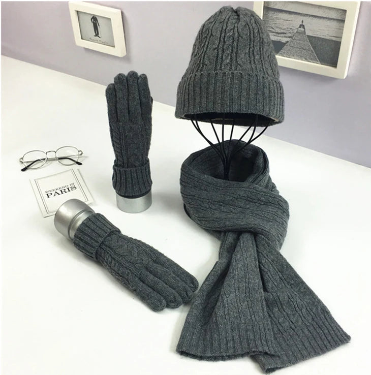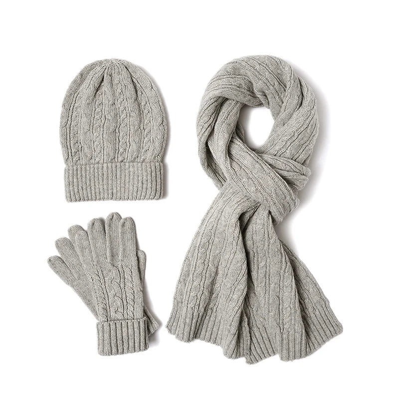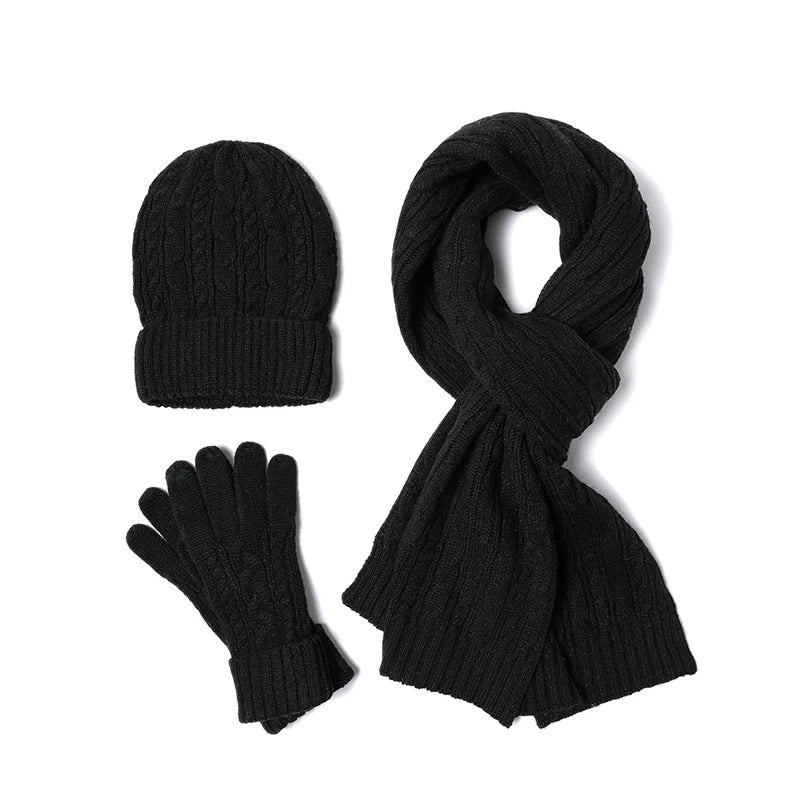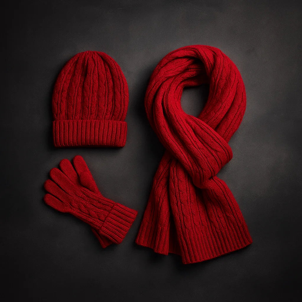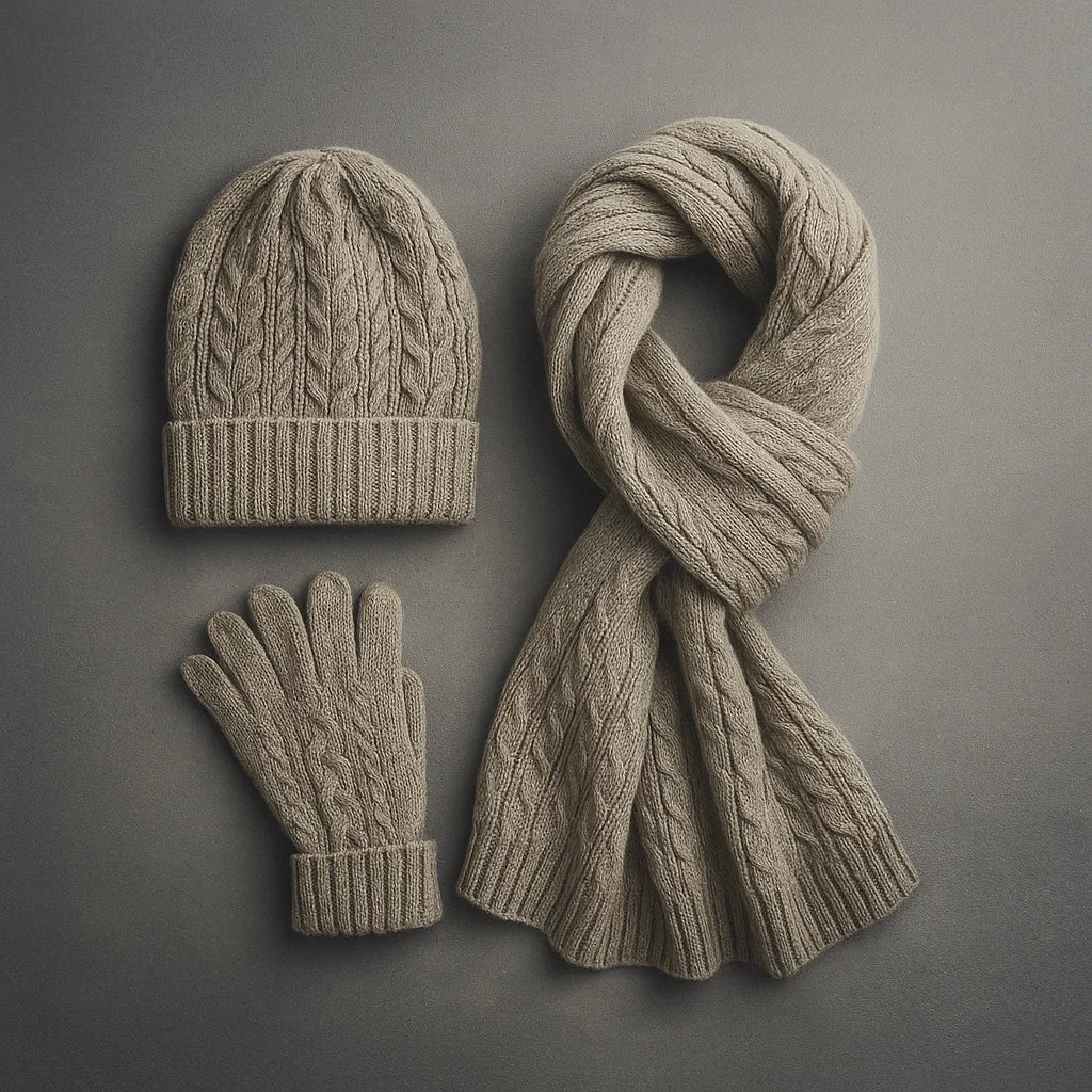A cozy three-piece winter set including a soft knit hat, scarf, and gloves. Designed for warmth and timeless elegance, this set adds a touch of sophistication to any cold-weather outfit.